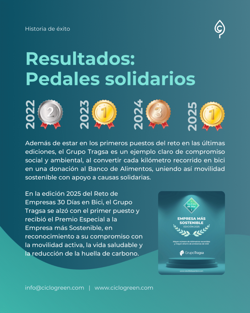 Además de estar en los primeros puestos del reto en las últimas ediciones, el Grupo Tragsa es un ejemplo claro de compromiso social y ambiental, al convertir cada kilómetro recorrido en bici en una donación al Banco de Alimentos, uniendo así la movilidad sostenible con el apoyo a causas solidarias.